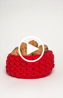 ------------------------------------------------------- EXPLANATIONS FOR THE PATTERN: ------------------------------------------------------- PATTERN: Small basket: See diagrams A.1 and A.4. Medium basket: See diagrams A.2 and A.4. Large basket: See diagrams A.3 and A.4. (Diagrams A.1a, A.2a, A.3a and A.4a show how the rounds start and finish) ------------------------------------------------------- START THE PIECE HERE: ------------------------------------------------------- BASKET - SHORT OVERVIEW OF THE PIECE: Work 1 small basket in red, 1 large basket in red and 2 medium baskets in mustard. The piece is worked in the round, from the middle of the bottom and up the sides. You work an edge in popcorn pattern which is turned outwards and finally a finishing edge. SMALL BASKET: Work 5 chain stitches with hook size 4 mm = US 6 and red and form them into a ring with 1 slip stitch in the first chain stitch. Work pattern in the round as follows: Work A.1a (shows how the rounds start and finish), A.1b a total of 12 times on the round. Work until there is 1 round left in A.1a and A.1b = 72 double crochets on the round – REMEMBER THE CROCHET GAUGE! The piece measures approx. 12 cm = 4¾" in diameter; the bottom is finished. Insert 1 marker in this round – THE PIECE IS NOW MEASURED FROM HERE! Work the last round and repeat this round until the piece measures 7 cm = 2¾". Work popcorn pattern and a finishing edge as described below. MEDIUM BASKET: Work 5 chain stitches with hook size 4 mm = US 6 and mustard and form them into a ring with 1 slip stitch in the first chain stitch. Work pattern in the round as follows: Work A.2a (shows how the rounds start and finish), A.2b a total of 12 times on the round. Work until there is 1 round left in A.2a and A.2b = 84 double crochets on the round – REMEMBER THE CROCHET GAUGE! The piece measures approx. 14 cm = 5½" in diameter; the bottom is finished. Insert 1 marker in this round – THE PIECE IS NOW MEASURED FROM HERE! Work the last round and repeat this round until the piece measures 7 cm = 2¾". Work popcorn pattern and a finishing edge as described below. LARGE BASKET: Work 5 chain stitches with hook size 4 mm = US 6 and red and form them into a ring with 1 slip stitch in the first chain stitch. Work pattern in the round as follows: Work A.3a (shows how the rounds start and finish), A.3b a total of 12 times on the round. Work until there is 1 round left in A.3a and A.3b = 108 double crochets on the round – REMEMBER THE CROCHET GAUGE! The piece measures approx. 18 cm = 7" in diameter; the bottom is finished. Insert 1 marker in this round – THE PIECE IS NOW MEASURED FROM HERE! Work the last round and repeat this round until the piece measures 7 cm = 2¾". Work popcorn pattern and a finishing edge as described below. POPCORN PATTERN: Now turn the piece so that you are working in the opposite direction (so that when the edge is folded outwards, the pattern will be on the right side). Work A.4a (shows how the rounds start and finish), A.4b a total of 24-28-36 times on the round. Work A.4a and A.4.b a total of 4-4-4 times in height. The piece measures approx. 13-13-13 cm = 5⅛"-5⅛"-5⅛" from the marker. Cut and fasten the strand. Fold the popcorn edge outwards. FINISHING EDGE: Work a finishing edge along the opening as follows from the right side: * 1 single crochet in each of the 2 double crochets between 2 popcorn stitches, work 1 chain stitch, skip 1 popcorn stitch *, work from *-* along the whole opening, finish with 1 slip stitch in the first single crochet. Cut and fasten the strand. |